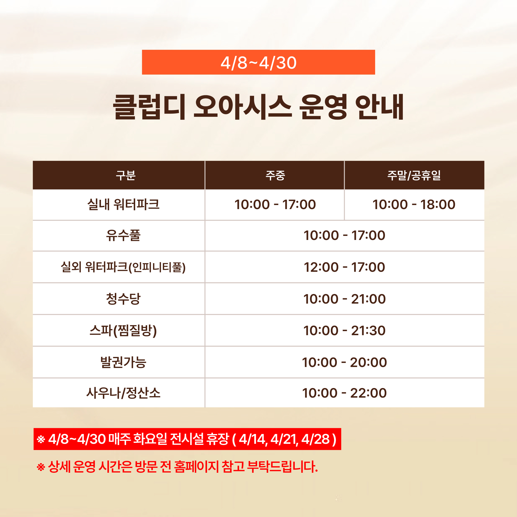 자세한 식음시설 안내는 클럽디오아시스 홈페이지 식음시설에서 확인 부탁드립니다.